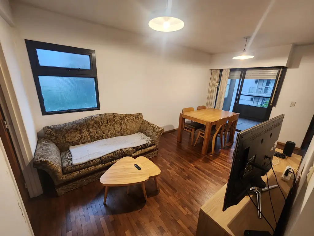 Ingreso a living con pisos de madera y salida por ventanales corredizos a primer balcón al frente con persianas. Cocina semi independiente con alacenas, bajomesada, horno y calefón a gas, ventilación natural y espacio para lavarropas.