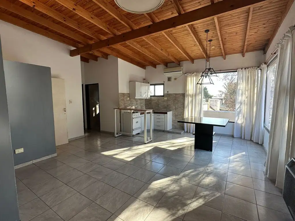 Al ingresar a la propiedad encontramos un espacio integrado entre living y comedor y cocina. El ambiente es amplio y luminoso con 2 ventanales en esquina y cortinas hechas a medida. La cocina posee muebles bajo y sobre mesada, equipo de aire acondicionado frio y calefaccion por estufa a gas tanto en living como en dormitorio.