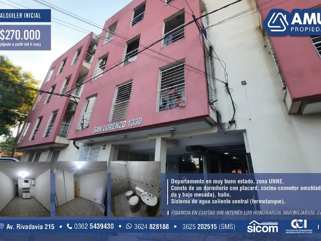 Departamento en muy buen estado, zona UNNE. Consta de un dormitorio con placard, cocina-comedor amoblada (mesada y bajo mesada), baño. Sistema de agua caliente central (termotanque).