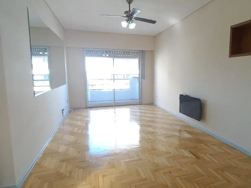Living al frente: 6x3mts piso de parquet plastificado a nuevo ventilador de techo con tres luces, espejo y placard de recepción.