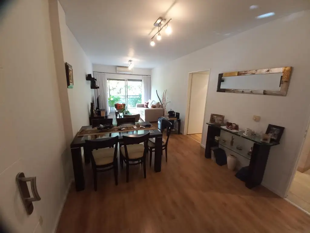 Living comedor, con salida al balcón con hermosa vista a la altura de los arboles, cocina con doble circulación al hall de distribución, dos dormitorios, ambos con salida al balcon, el principal con vestidor y en suite, otro baño completo, que actualmente tiene instalado un espacio para lavarropas, pero se puede utilizar la ducha también. cuenta con 2 equipos de aire acondicionado (living y dormitorio principal), losa radiante y caldera individual.