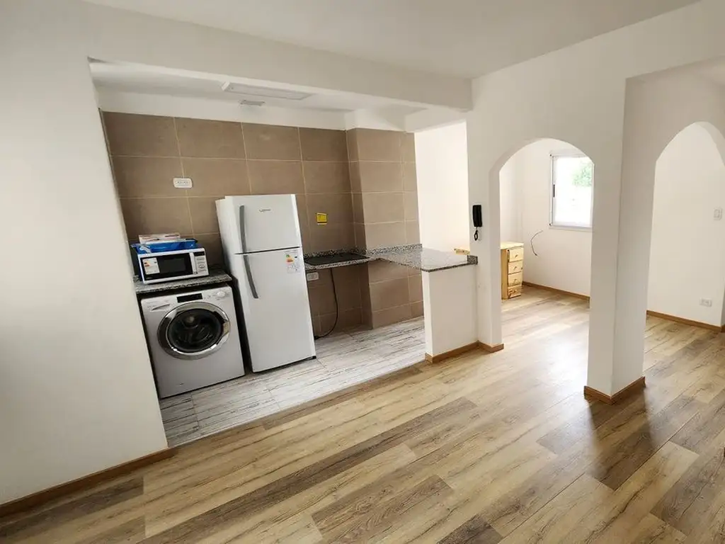 Ingresamos por el living, con cocina integrada. Pisos símil madera. Grandes ventanales que dan mucha luz y ventilación cruzada. El departamento se entrega con un anafe de vitrocerámica, un microondas, lavarropas, heladera y termotanque eléctrico. Mesadas de granito y barra para desayuno.