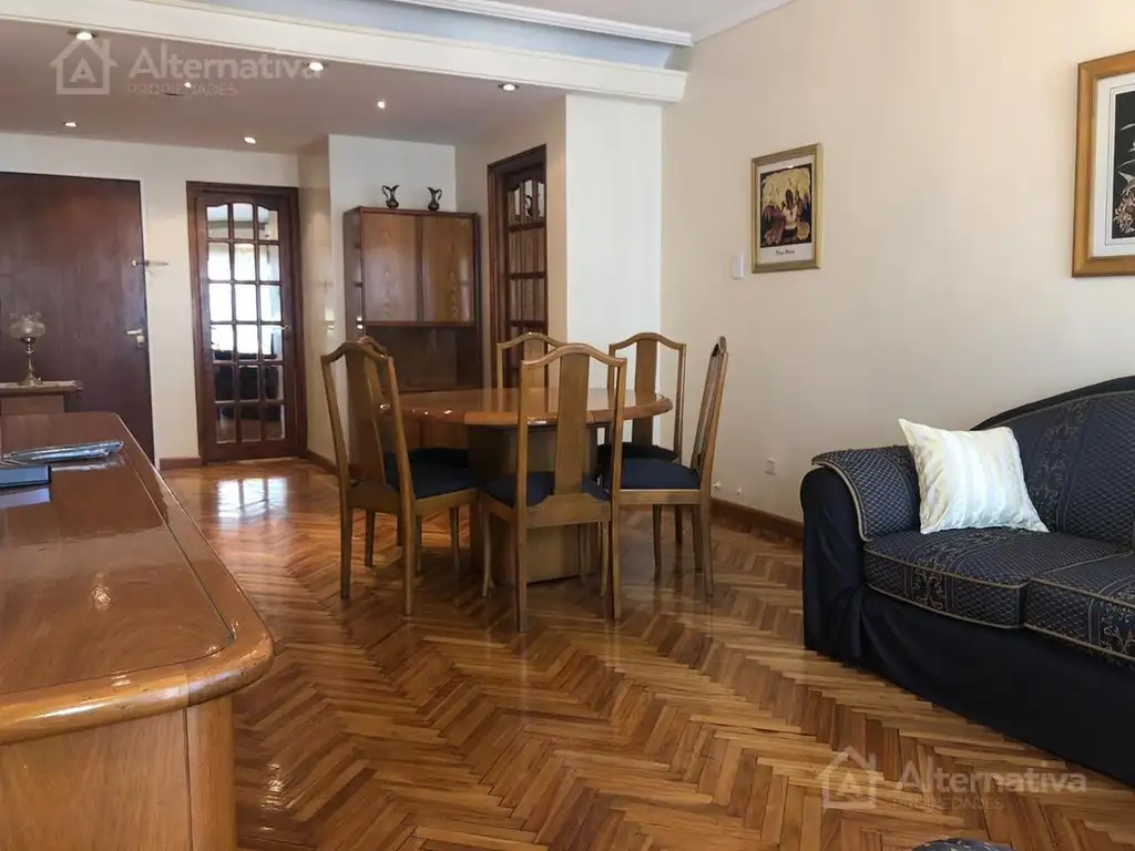 La unidad ubicada en un cuarto piso, tiene doble circulación y 2 entradas, la principal al frente por medio de un palier privado, por donde se accede al Living Comedor, completo con mesa y 6 Sillas, dos vajilleros: uno bajo y otro alto, 2 Sillones de 2 cuerpos y TV Smart, con aire acondicionado Frío /Calor, gran ventanal y balcón Corrido.