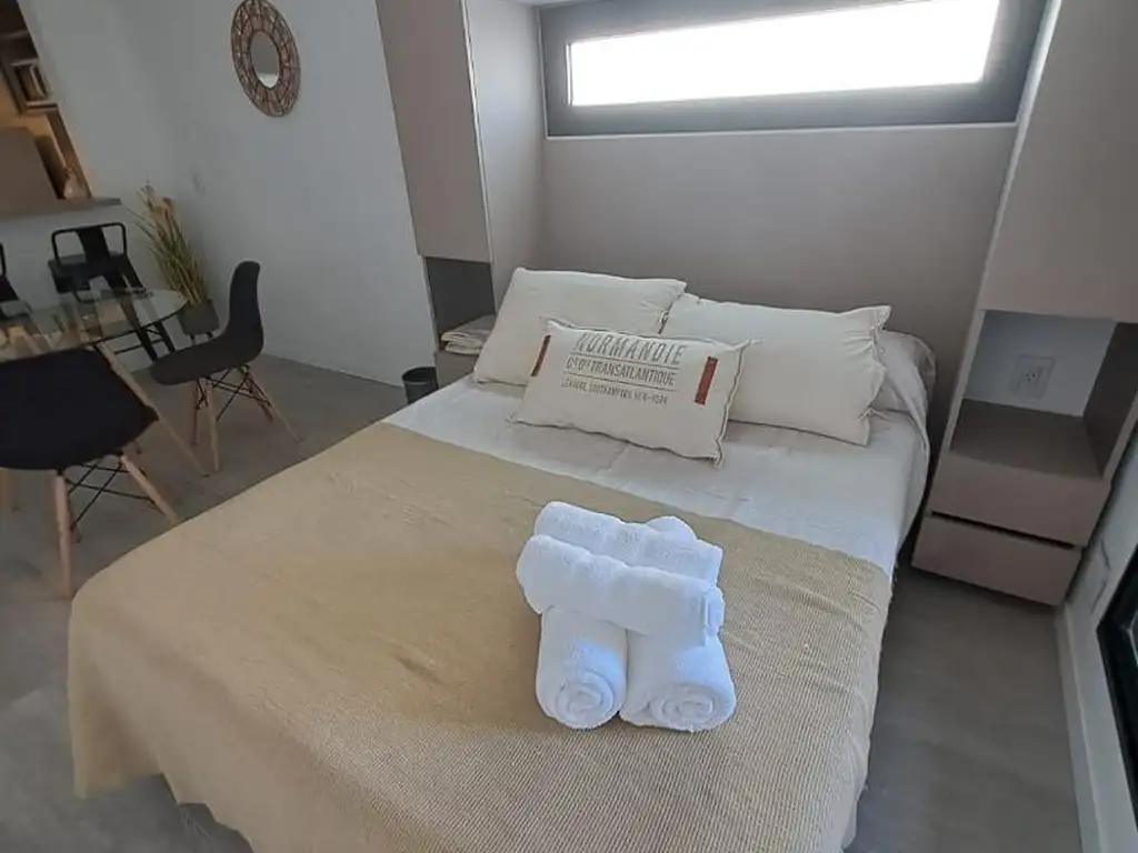 Departamento studio a estrenar. Sexto piso con balcón al contrafrente. Muy luminoso. Cocina equipada con Heladera con freezer, cocina a gas, microondas, vajilla. La cocina esta integrada mediante una barra desayunadora con dos banquetas altas. El ambiente principal cuenta con mesa y sillas comedor estilo nórdico, cama doble con mueble en cabecera y mesas de luz. TV, aire acondicionado Frío/ calor. Radiadores en ambiente principal y en el baño. Baño completo.