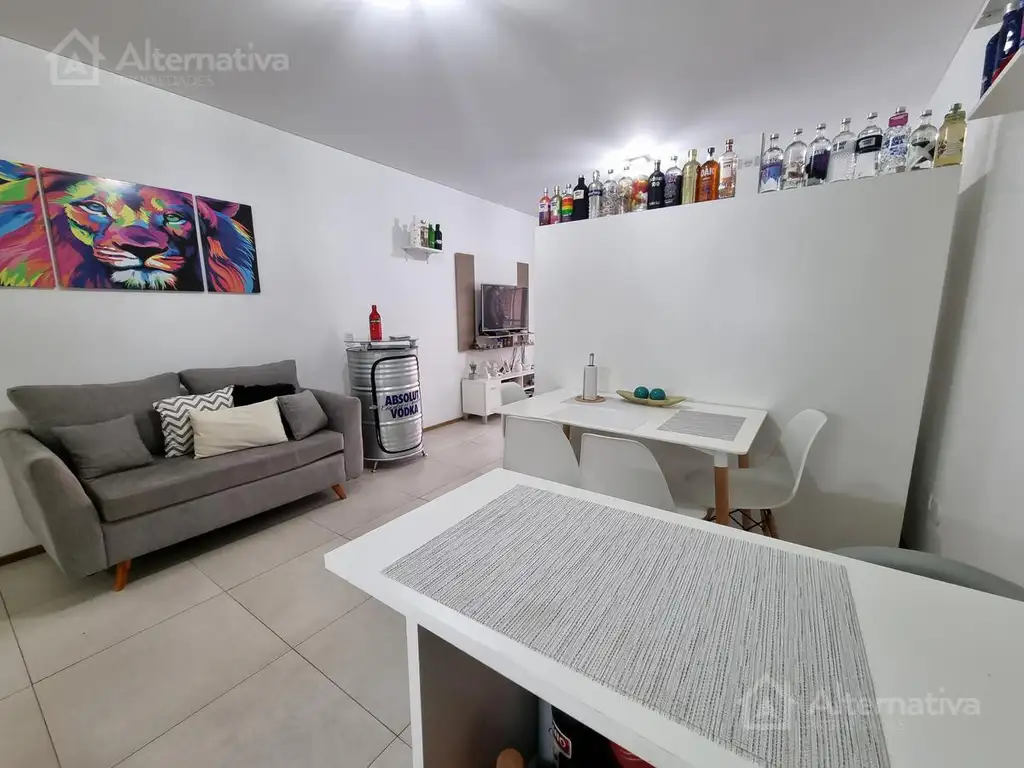 El departamento cuenta con cocina integrada, Heladera con Frezzer, horno microondas barra desayunadora con dos banquetas, mesa con 4 sillas, cocina a gas con 4 hornallas y horno.