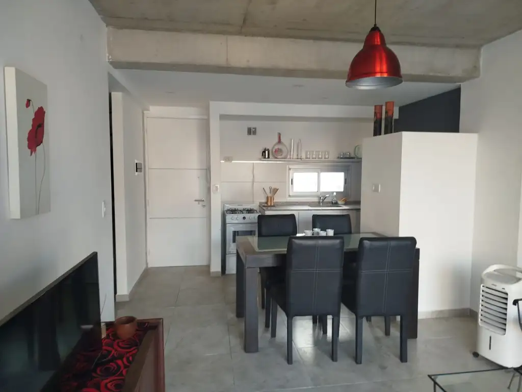 MONICA BIANCHINI BIENES RAICES ALQUILA excelente departamento totalmente amoblado.Consta de cocina con mueble bajo mesada, amplio living con balcon aterrazado, dormitorio con dos camas, placard con cajones y divisiones, baño completo con vanitori.
