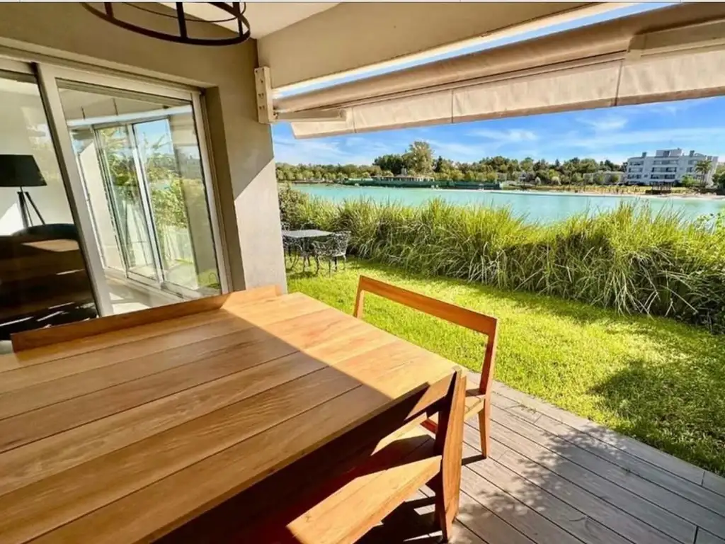 Departamento en Planta Baja , con jardín , galería y parrilla. Vista directa a la Laguna. Dormitorio en suite con vestidor y baño completo, segundo dormitorio con 3 camas , amplio living comedor con cocina integrada, lavadero , baño completo , dos cocheras ( una de ellas con toldo). Jardín con controlador de riego automático, por toberas y aspersores, toldo automático ( Hunter Douglas) en la galería con sensor de viento, muebles de incienso en la galería , doble cortinado screen y black out en todos los ambientes (Hunter douglas) el edificio cuenta con equipo Ablandador de agua . Aires acondicionados inverter frío calor en todos los ambientes . Amoblamiento completo en todos los ambientes, heladera con freezer , Lavarropas, microondas,cafetera,TV.