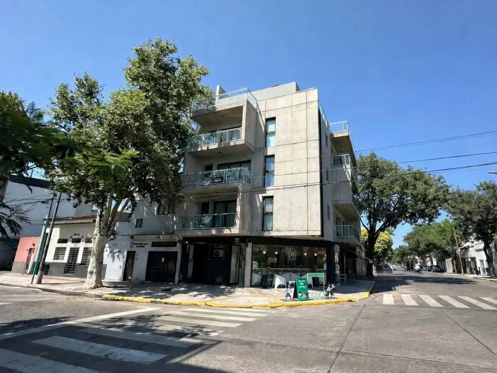 Salida a un balcón. Baño completo. Dormitorio con cama, mesas de luz y cortinas.