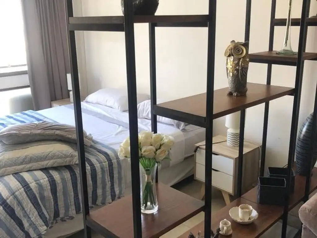 El departamento es al frente,muy luminoso y aireado. El ambiente está separado x una linda y moderna biblioteca abierta que da amplitud.El sector de dormitorio tanto como el de living que cuenta con cocina integrada están totalmente equipados.
