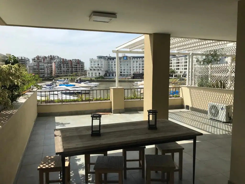 Es un dos ambientes de 60 m2 aproximados + terraza cubierta y semicubierta de 50 metros aprox., total de 110 metros, con cochera semicubierta y balcón aterrazado y parrilla. Todo con vista abierta a Bahía Grande de Nordelta, Hotel Wyndham. Excelente orientación Noreste. Cocina completa con barra y banquetas desayunadora y comedor diario. Dormitorio de 3.50 x 3.30 en suite con vestidor, sommier king 180x200.