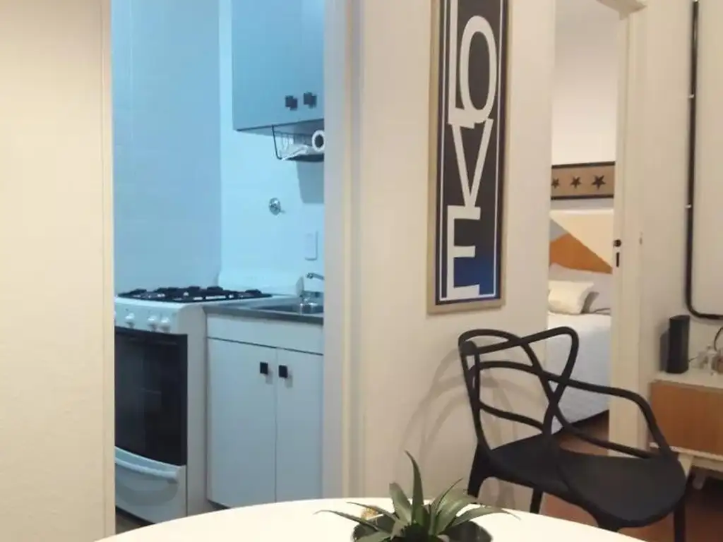 El departamento es amplio y luminoso, cuenta con un ventanal con salida a un balcón con vista abierta hacia la calle, en el que se encuentra el lavarropas automático. La cocina es separada, está amoblada con alacena y bajo mesada y completamente equipada con heladera con frizzer, cocina a gas nueva, microondas, cafetera, pava eléctrica, utensilios de cocina y vajilla. El área del living comedor cuenta con mesa de comedor con sillas, sillón cama y TV Smart 32 pulgadas. El dormitorio cuenta con cama tamaño matrimonial, mesas de luz, un amplio placard y ventana. Incluye toallas, sábanas y ropa de cama. El baño es completo con bañera. Cuenta con ventilador de techo y aire acondicionado frío/calor.