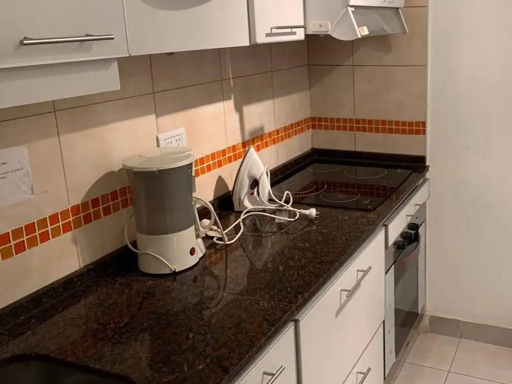 Cocina equipada con Cocina, Heladera, termotanque eléctrico, cafetera, alacena y bajo mesada de melanina color blanco.