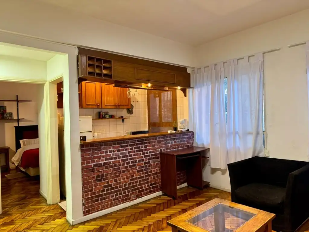 Ubicación inmejorable de excelente departamento de 2 ambientes en planta baja, ubicado en una de las zonas más buscadas de la Ciudad de Buenos Aires. El inmueble cuenta con un living-comedor integrado, moderno y funcional, con cocina completa equipada y barra desayunadora, ideal para optimizar el espacio y la comodidad.