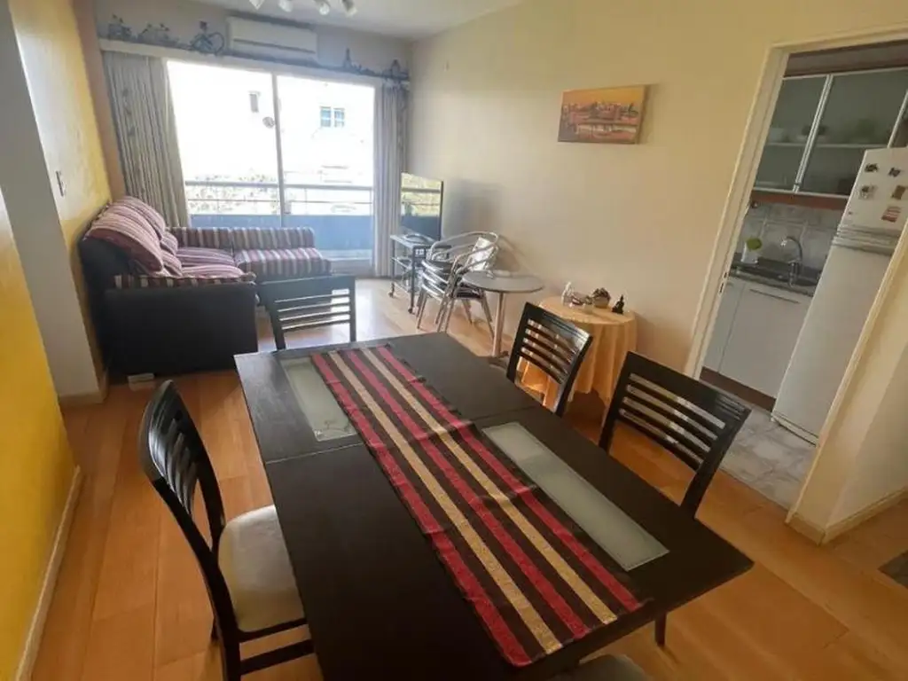-Living-comedor con mesa, sillón, televisor y aire acondicionado frío/calor. En la temporada de frío, el departamento cuenta con loza radiante.