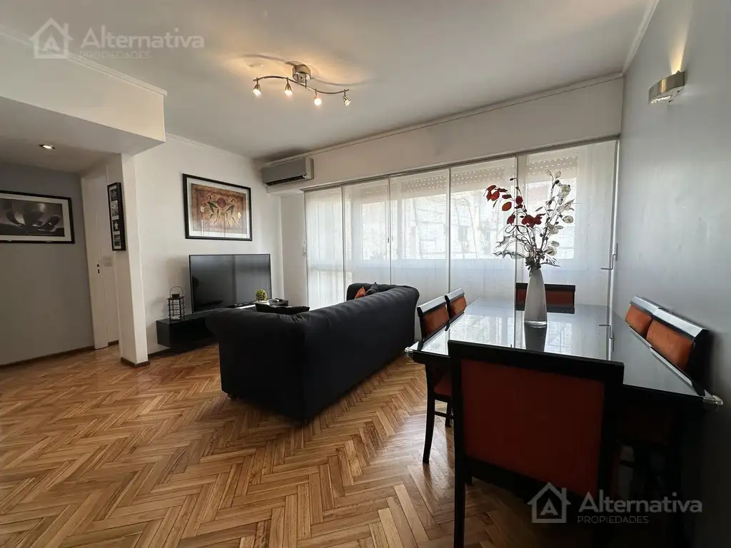 Departamento de tres ambientes en Palermo cuenta con mesa con seis sillas - sofá de tres cuerpos muy cómodo - rack TV Smart curvo de 55 pulgadas - aire acondicionado split - internet wi-fi - gran ventanal con salida a un pequeño balcón con excelente luz natural y muy buena circulación de aire - en el balcon tender y una pequeña parrilla empotrada.