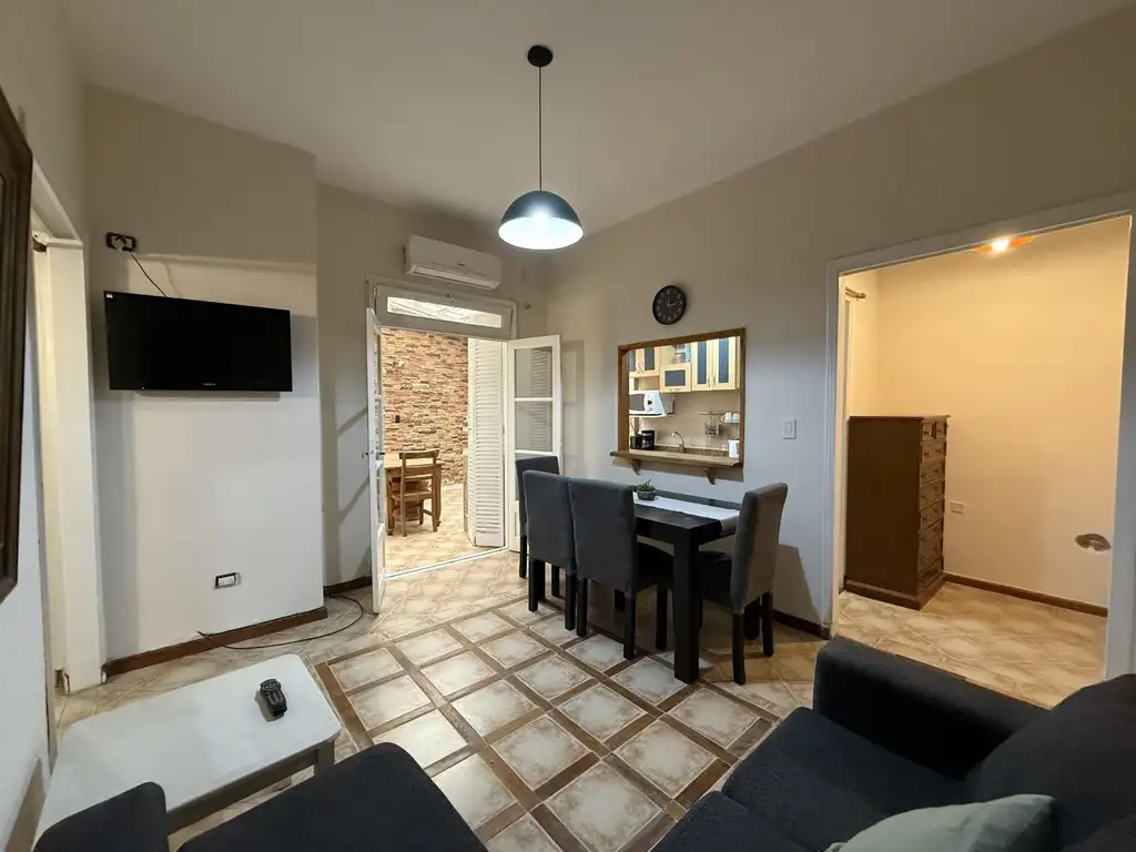 Equipado y amueblado, living comedor con mesa y sillas, aire acondicionado, TV y salida al patio.