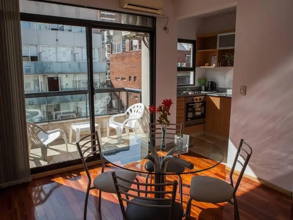 El departamento cuenta con sector de living con sofá, televisión, sector de cocina con mesa y sillas, cocina con bajo mesada, alacena, utensilios de cocina, heladera, cocina. Habitación con cama matrimonial Queen, placard amplio, mesa de luz con lamparas. Balcon al frente con mesa y sillas. Baño con bañera, lava manos. Se ubica en el 7mo piso. Cuenta con Toilette.
