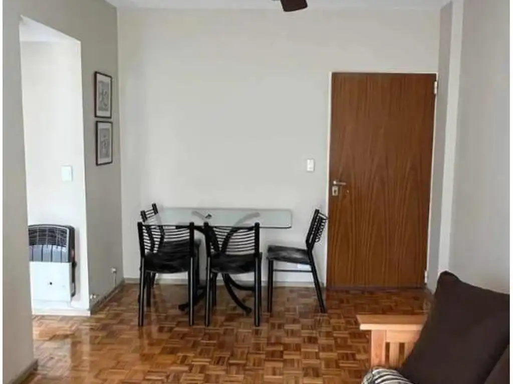 Departamento de dos ambientes en disposición contrafrente con mucha entrada de luz. Puerta blindada , recién reciclado con cocina y baño a estrenar. Se encuentra totalmente equipado con aire acondicionado, frio/ calor, cocina completa con microondas, lavarropas, pava eléctrica, licuadora, tostadora y cafetera.Posee balcón y amplio placard en la habitación.
