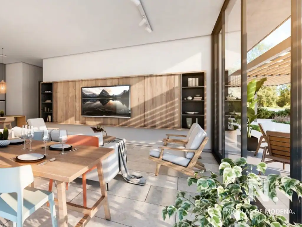 El departamento destaca por su amplio living-comedor, que se integra armoniosamente con una cocina americana. Este diseño abierto no solo optimiza el espacio, sino que también crea un ambiente acogedor y versátil, ideal para disfrutar tanto de la vida diaria como para recibir invitados.