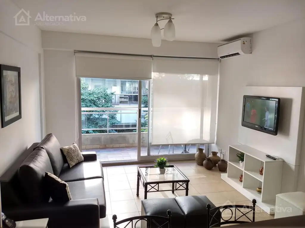 El living está equipado con un sofá cama, un LCD de 32" con conexión de cable y equipo de aire acondicionado. De aquí se accede a un gran balcón corrido equipado con dos juegos de sillas y mesa.