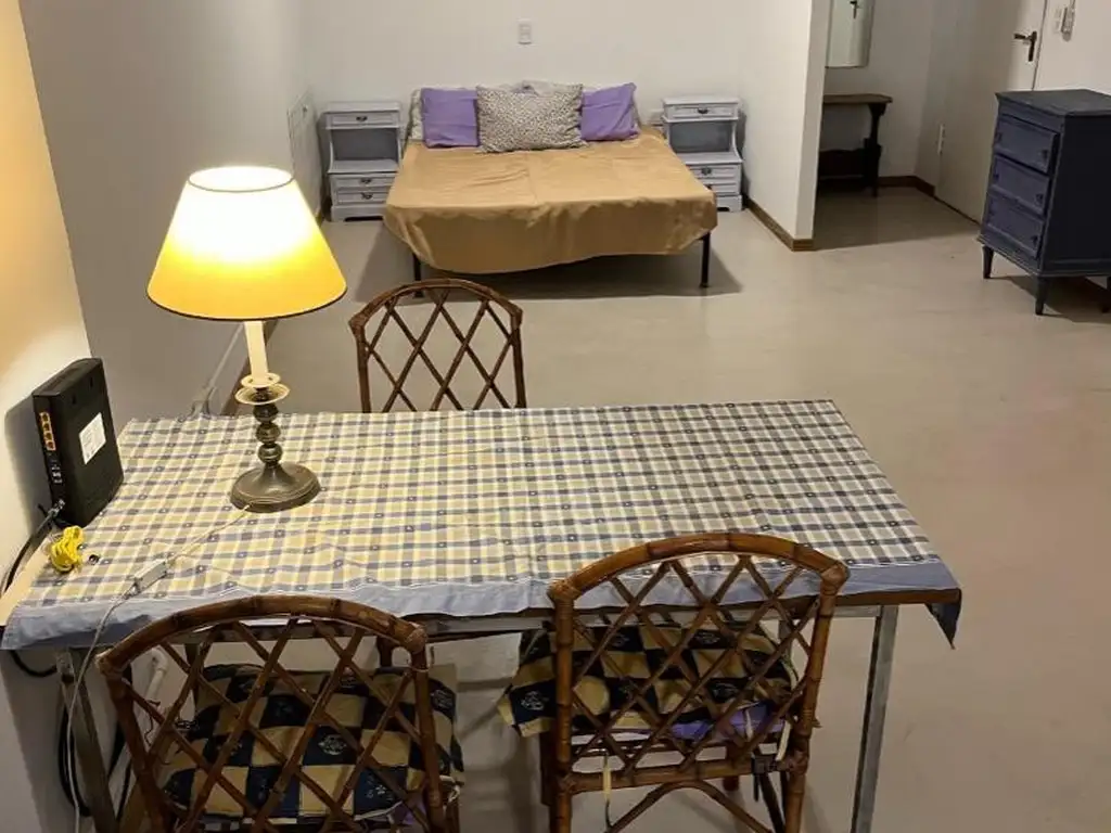 El departamento cuenta una habitación con cama matrimonial, mesa de luz, living con mesa y sillas. Cocina con bajo mesada, microondas, horno eléctrico, utensilios de cocina. Baño con ducha. Se encuentra en el 5to piso. Amplio palier.