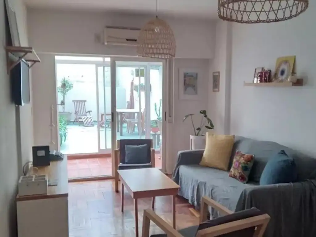 El departamento es amplio y luminoso. Cuenta con ventanas y aires acondicionados frío/calor en todos los ambientes y estufa eléctrica. Tiene un patio privado muy amplio con mesas, sillas y pileta propia. La cocina está completamente amoblada y equipada con heladera con frizzer, cocina a gas, electrodomésticos, utensilios de cocina y vajilla. Desde la cocina se accede al área del lavadero que está también amoblado con alacena y bajo mesada y cuenta con lavarropas y pileta de lavado. El living comedor posee mesa de comedor con cuatro sillas, sofá, sillones y Smart TV. Desde el living se accede a la galería que tiene ventanales con vista al patio y cuenta con escritorio y dos sillones de un cuerpo. El dormitorio principal cuenta con una cama tamaño queen, placard empotrado con mucho espacio de guardado, y TV con Chromecast. El segundo dormitorio cuenta con dos camas de una plaza. El baño principal es completo con bañera. Tiene además un toilette de recepción. Incluye Wifi.