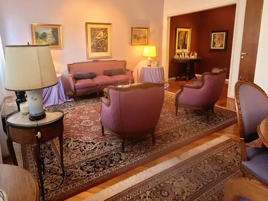 Living comedor: Muy luminoso. Con muebles de estilo. Tiene un juego de mesa con 6 sillas, vajillero en madera con puertas, mesas redondas individuales con lámparas, aire acondicionado frio calor, un sillón tapizado en bordeaux con dos sillones individuales con una mesa ratona