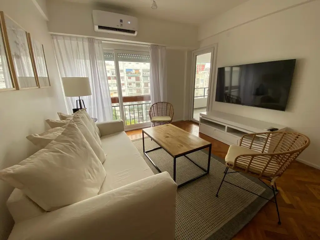 La unidad consta de un amplio living compuesto por juego de mesa y cuatro sillas, Sillon de 3 cuerpos con mesa baja y 2 sillones Gervasoni, Tv Smart ,Rack blancoy Aire Acondicionado F/C.