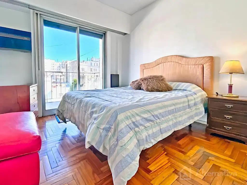 Es super luminoso, tiene balcón corrido con vista abierta, living con sofá, tv, y mesa comedor.