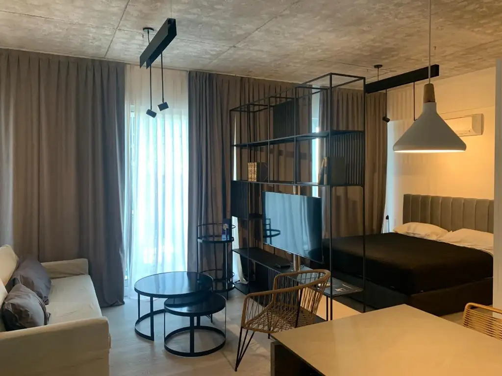 Loft amplio con sector de cocina amplia con anafe, microondas, heladera con frezzer, aire acondicionado, bajo mesada, mesa con sillas, cuenta con portero. Sector de habitación con cama matrimonial de dos plazas, con sabanas, almohadas, acolchado, respaldo de cama, mesa de luz, aire acondicionado. Baño con ducha, lava manos, inodoro, placard. Living con sillón de dos cuerpos, mesa ratona, mueble de tv con Televisión. Balcon amplio al lateral muy luminoso con vista al puerto.