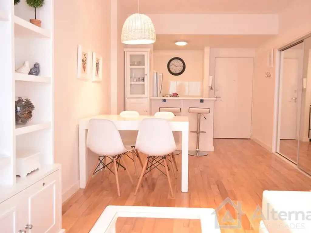 Cuenta con una habitación con baño en suite, amplio living con sofá cama y cocina tipo americana totalmente equipada con heladera, horno a gas, tostadora, cafetera y microondas. El departamento es muy luminoso con excelente ambientación y decoración.