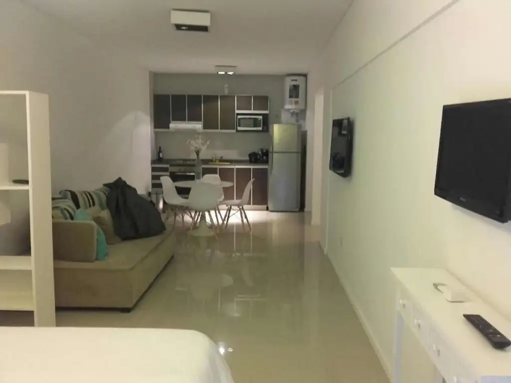 El departamento cuenta con sector de cocina con alacena, bajo mesada, microondas, cocina con horno, heladera con frezzer, tractor de humo, utensilios de cocina, mesa con sillas de estilo nórdico, sillón, televisión, sector de habitación con cama de dos plazas, muebles mesa de luz, lamparas, aire acondicionado. Baño con bañera, inodoro, bidé, lava manos con espejo.