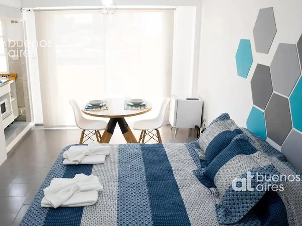 Monoambiente equipado para dos. VISTA PANORAMICA A RIO Y CIUDAD! Cocina integrada y baño completo. Luz y sol en toda la unidad.