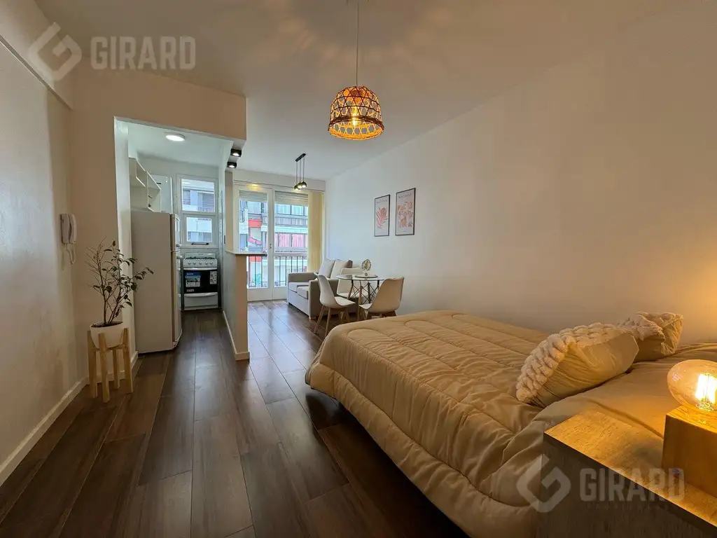 Departamento de 1 amb con balcon a la calle, cocina con microondas, heladera y lavarropas. Ambiente cómodo con cama matrimonal