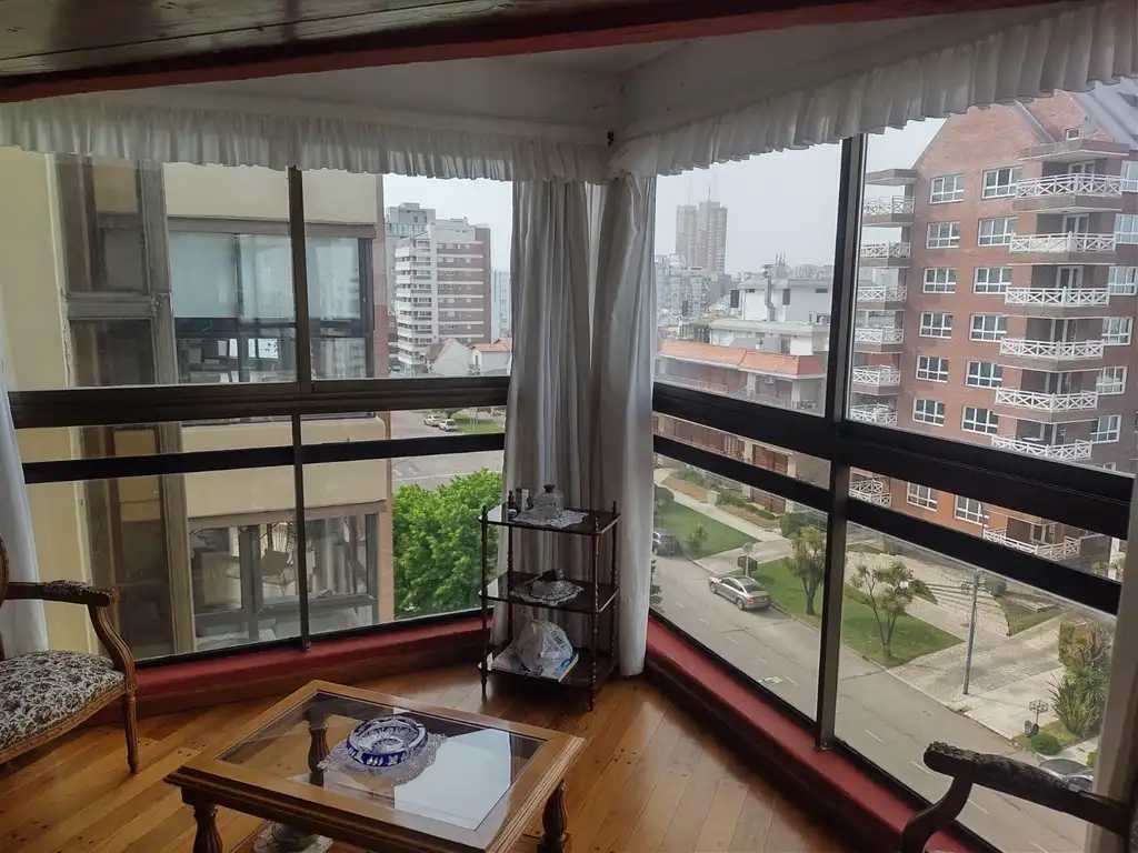 - Living comedor con juego de mesa, sillas, TV de 20 pulgadas y sillón. Vista a la Avenida Colón y al mar