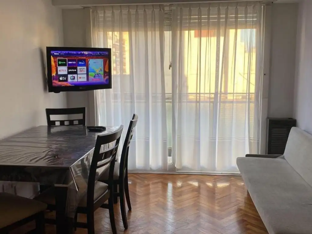 Cuenta con cocina completa, cocina, heladera, microondas, utensilios de cocina, alacena bajo mesada, cuenta con aire acondicionada, cuenta con comedor con mesa y sillas, un sillón con televisión con salida al balcón muy luminoso, el departamento también cuenta con un sector de pileta para lavado de ropa y lavarropas. La habitación muy luminosa, con cama matrimonial, con toallas, ropa de caba, sabana, acolchado , mesa de luz, con ventilador de techo, piso de parque, todo pintado en perfectas condiciones, con placard grande. baño muy luminoso con vida, lava manos, bañera, cortinas. Balcon ubicado al lateral.