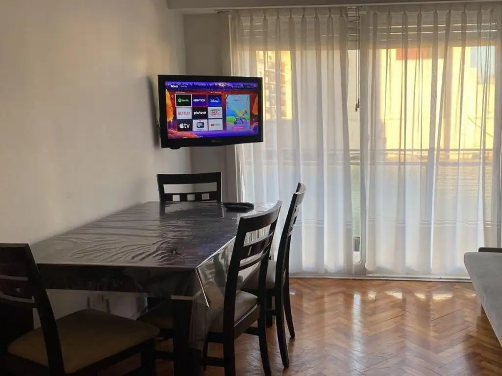 Cuenta con cocina completa, cocina, heladera, microondas, utensilios de cocina, alacena bajo mesada, cuenta con aire acondicionado, cuenta con comedor con mesa y sillas, un sillón con televisión con salida al balcón muy luminoso, el departamento también cuenta con un sector de pileta para lavado de ropa y lavarropas.