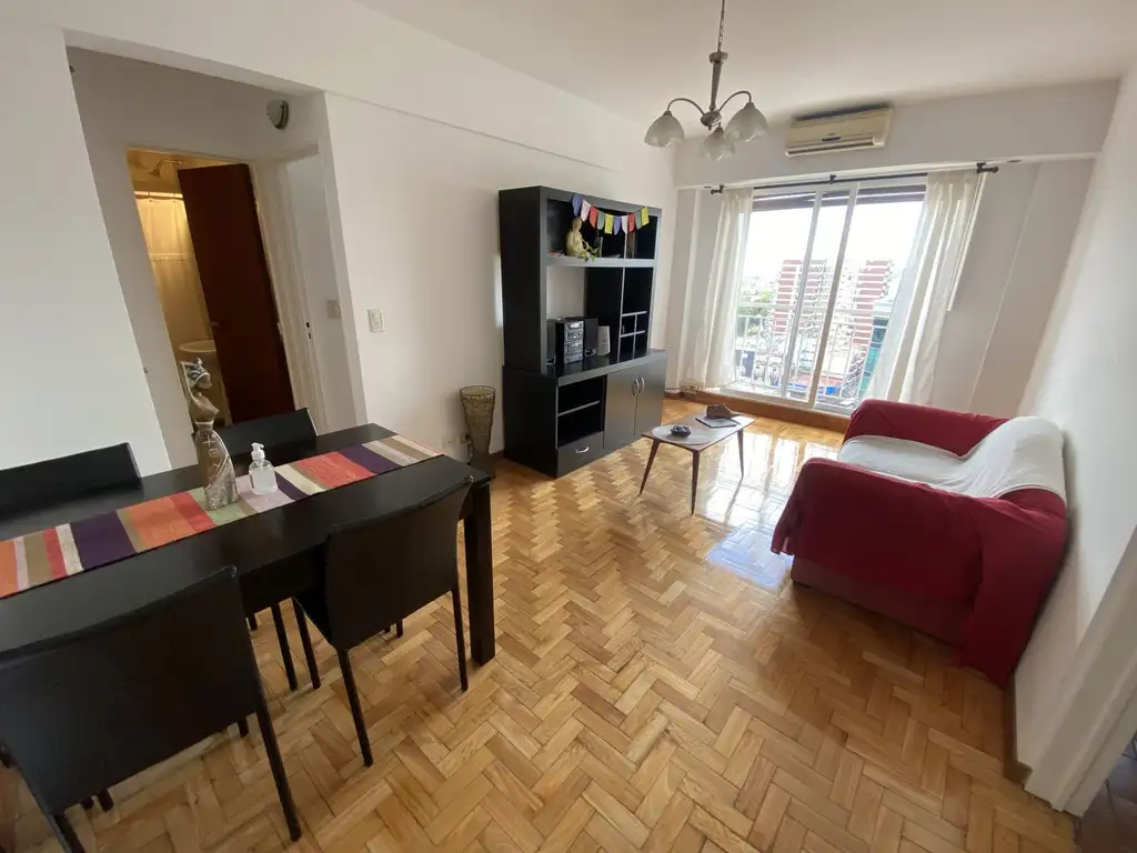 Living comedor con aire acondicionado, sofa cama, mesas con sillas, pasillo de distribucion con placard, baño completo con bañera y dormitorio amplio con sommier de dos plazas, mesas de luz y placard empotrado.