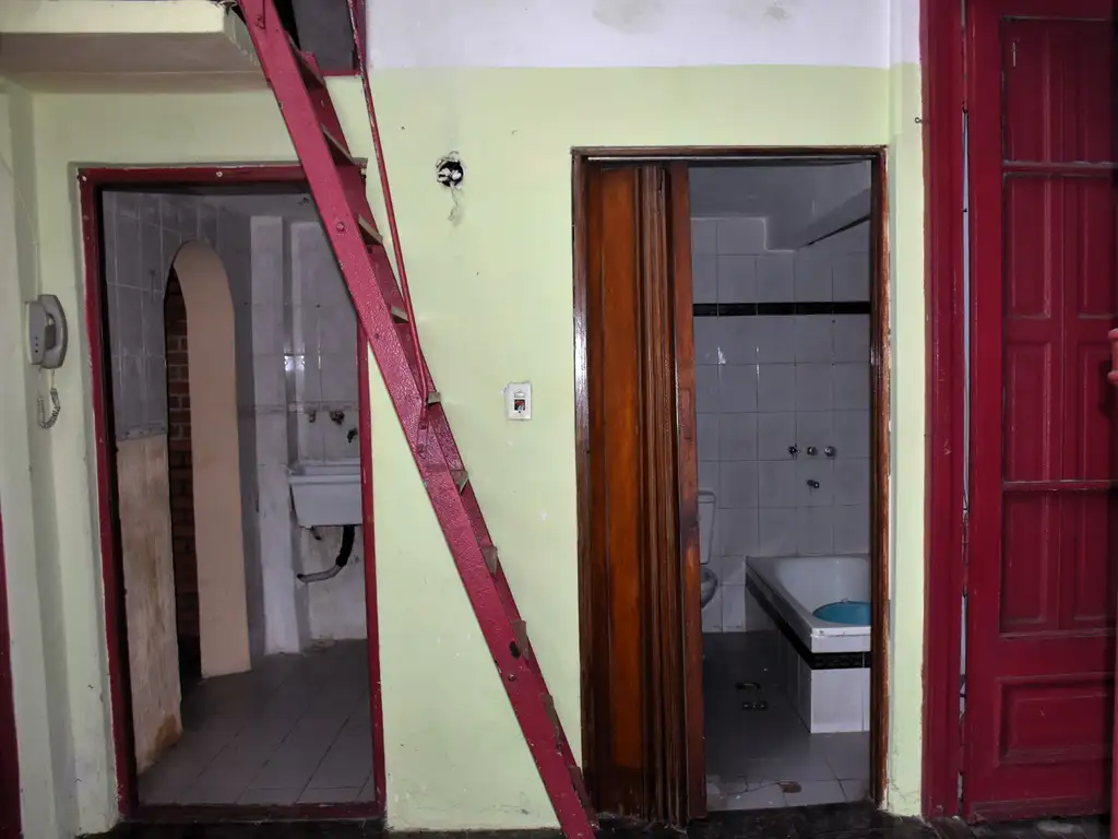 Ingreso por pasillo semicubierto a hall distribuidor con pisos de baldosas y gran ventanal de hierro y vidrios repartidos, comedor con piso de pinotea y ventilación al exterior, cocina con doble circulación sin artefactos ni mesada, baño completo con todos sus artefactos, y 3 dormitorios; dos de ellos de generosas medidas y doble altura, y el restante con acceso por escalera situado sobre baño y cocina, todos con pisos de pinotea y en regular estado. Departamento a reciclar. Consulte
