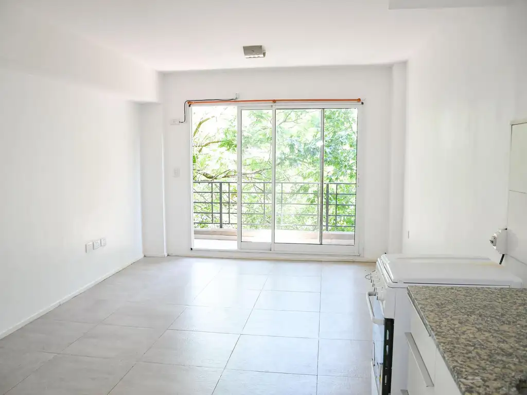 El ambiente principal es luminoso y funcional, con salida directa al balcón, generando una sensación de amplitud y aire poco habitual en este tipo de unidades.