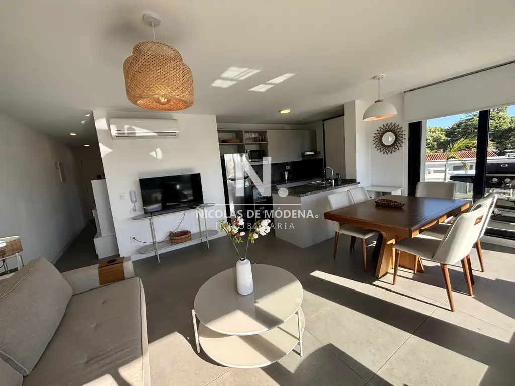 La propiedad consta de dos dormitorios y dos baños completos, proporcionando privacidad y comodidad para hasta cuatro huéspedes. La cocina, integrada mediante una barra desayunadora, se conecta de manera fluida con un luminoso living comedor, creando un espacio social versátil y funcional, adecuado para la relajación y el entretenimiento.