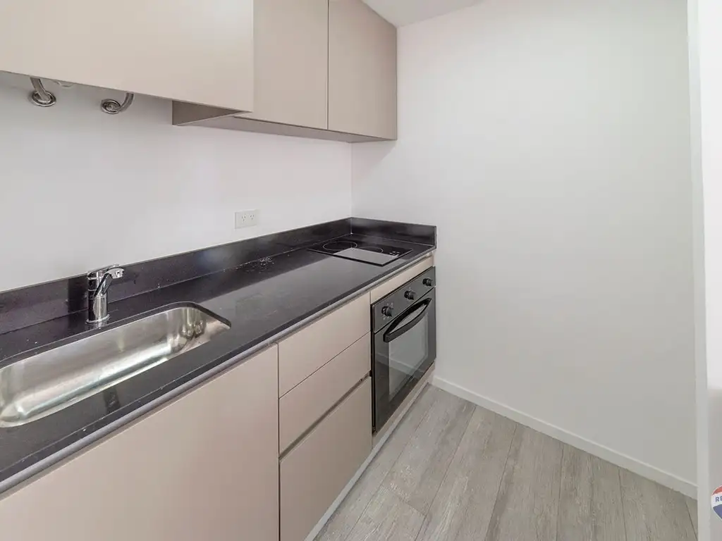 Cocina equipada con honro y anafe, mesada de cuarzo y conexión para lavarropas.