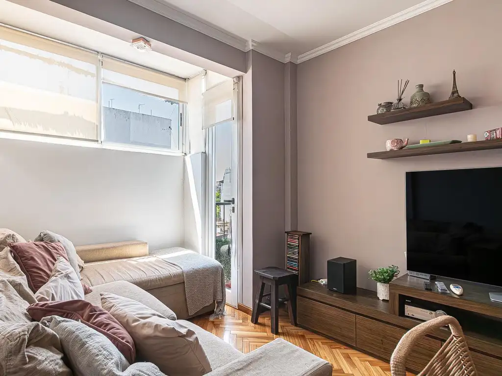 Cuenta con living comedor, dormitorio principal y segundo dormitorio que actualmente se usa como escritorio. Tiene muy buenos placares. Balcón corrido con vista abierta al contrafrente.