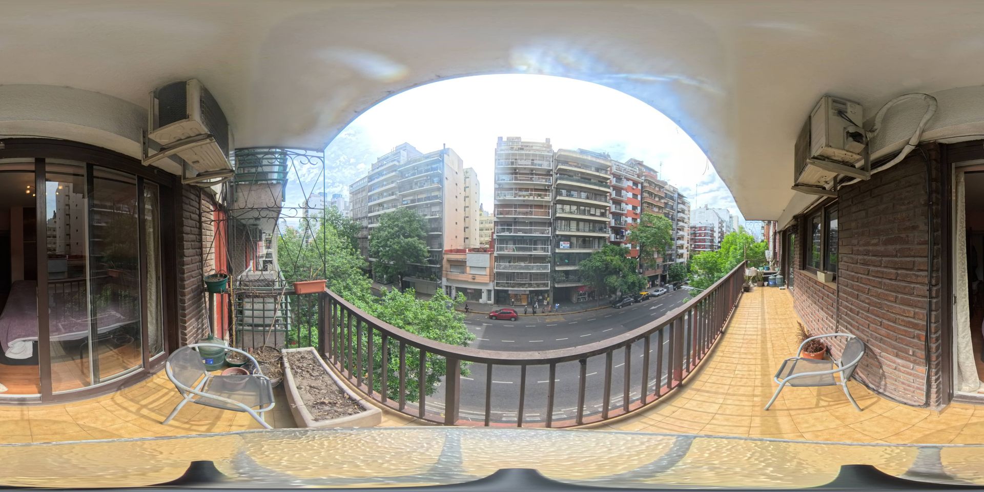 The spacious living-dining room has direct access to a large, continuous balcony approximately eight meters long by one and a half meters wide, with an open view of the avenue. This balcony runs the entire length of the apartment\'s facade, also encompassing one of the bedrooms, whose window faces the street, and culminating in the master bedroom, which has a second balcony door. This arrangement provides cross-ventilation and ample natural light in all the main rooms.