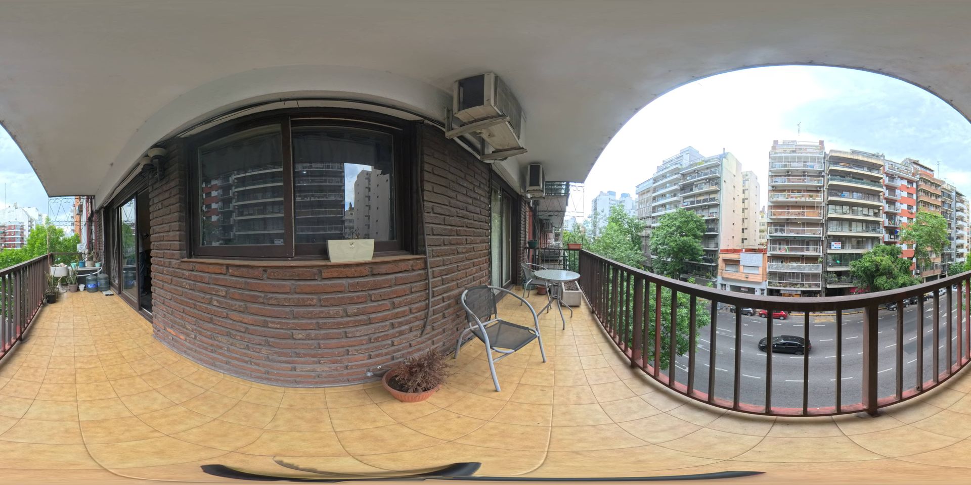 El amplio living comedor cuenta con salida directa a un gran balcón corrido de aproximadamente ocho metros de largo por un metro y medio de ancho, con vista abierta sobre la avenida. Este balcón recorre todo el frente del departamento, abarcando también uno de los dormitorios cuya ventana da al frente y culmina en el dormitorio principal, que dispone de una segunda puerta balcón. Esta disposición genera ventilación cruzada y una notable entrada de luz natural en todos los ambientes principales.