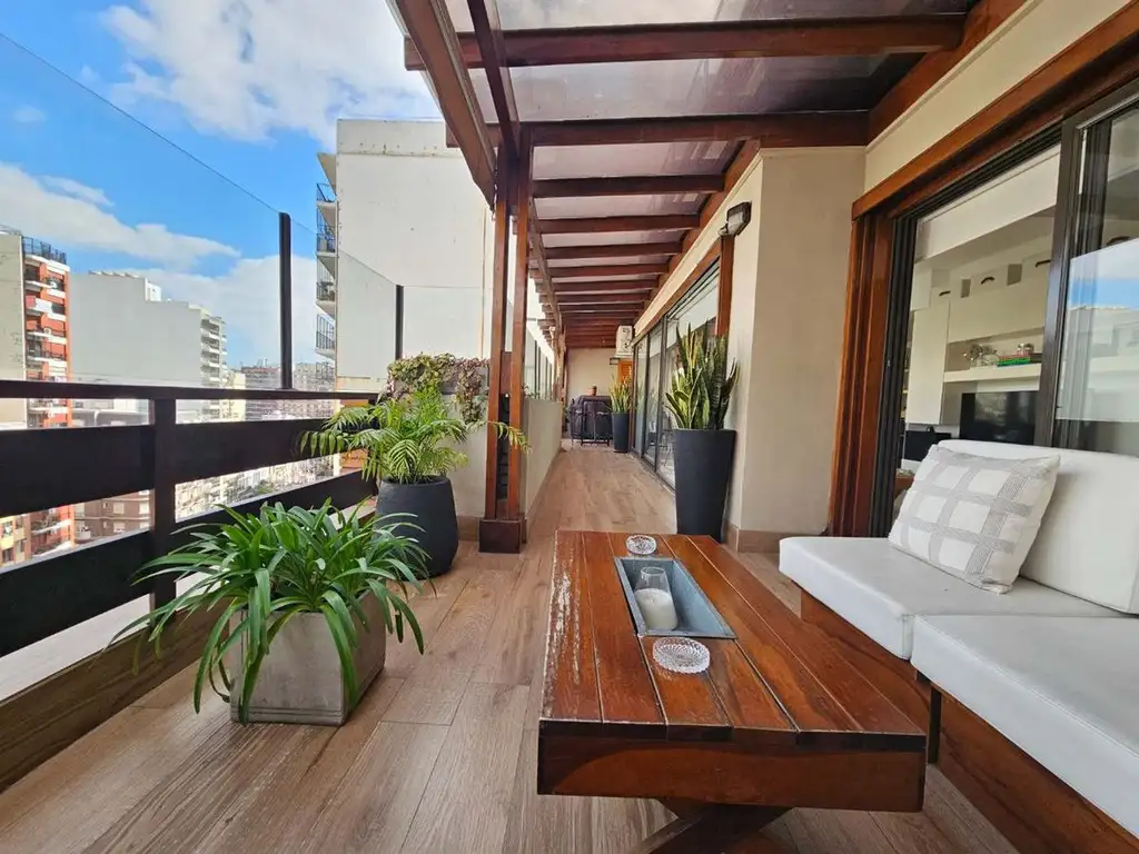 El amplio living-comedor de 5,90 x 2,90 m y 4,75 x 3,30 m, respectivamente, posee salida a un gran balcón corrido semicubierto de 13,50 m de largo y 3 m de profundidad en sus extremos, con un sector tipo living en un extremo y Parrilla con barra y banquetas en el otro.