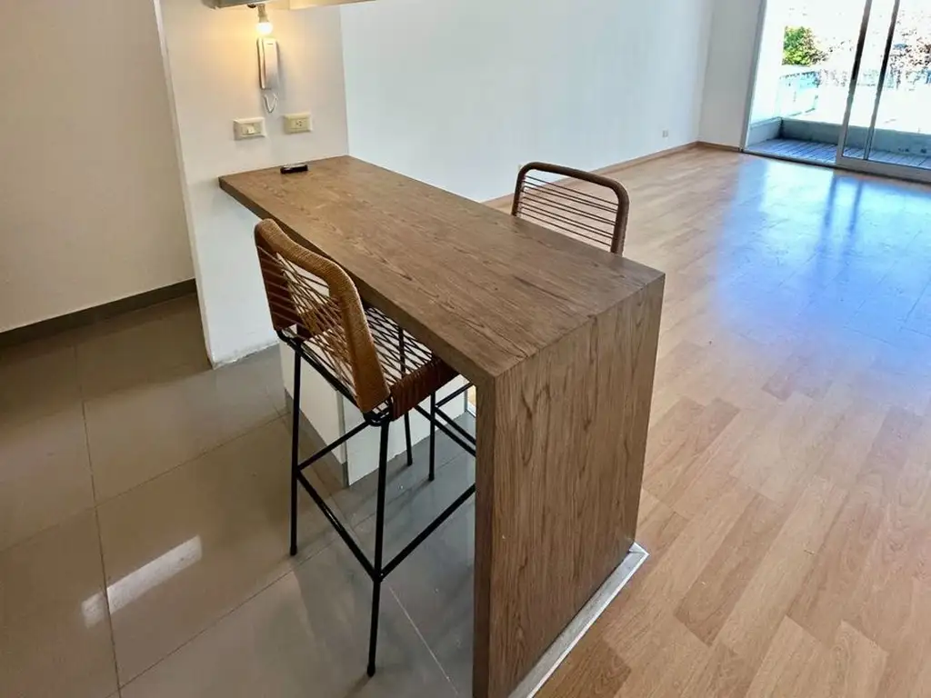 El departamento despliega un concepto de living integrado y muy practico. El ambiente único combina dormitorio, cocina separada con barra para banquetas y un baño amplio. El balcón se transforma en el punto de conexión entre el interior y la energía de la ciudad, permitiendo que la luz natural expanda visualmente el espacio con vista al contra frente a la pileta y jardin del edificio que aporta mucha privacidad y silencio al estar despejado de la calle.