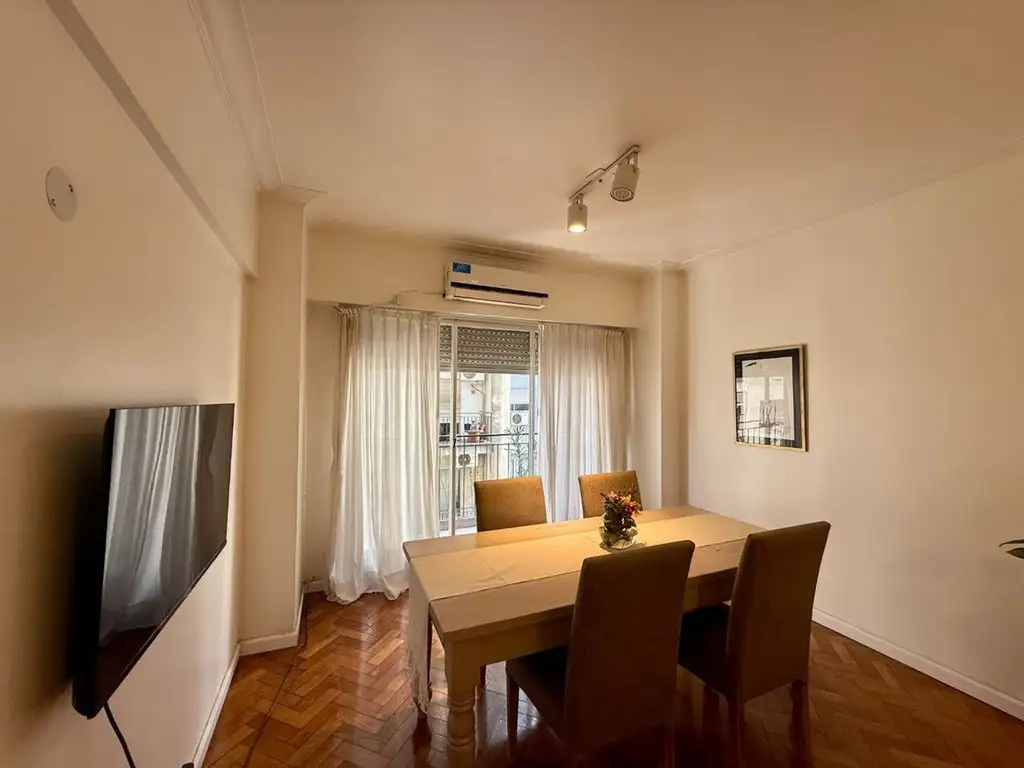 El living-comedor es amplio, muy luminoso y con salida a un balcón corrido. Sus pisos de parqué plastificados, en impecables condiciones, realzan la calidez del espacio. El ambiente permite armar cómodamente sector de living y comedor, manteniendo fluidez y amplitud visual.