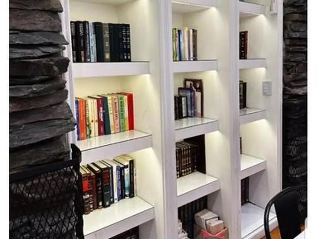 Biblioteca empotrada entre columnas de piedra, aportando distinción y funcionalidad.