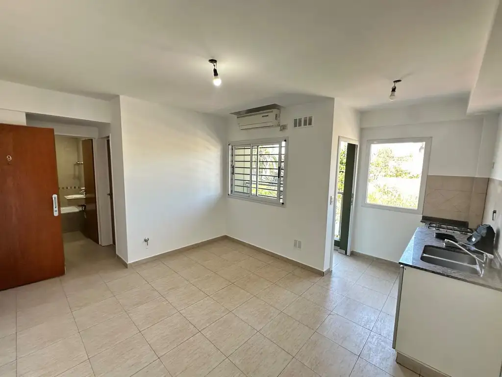 Al ingresar al departamento, se observa un living comedor cómodo y luminoso gracias a su disposición al frente (3,80 x 4). Desde allí se accede a un balcón de 3 x 1,5, ideal para disfrutar de la ventilación natural. El dormitorio (2,70 x 3) también cuenta con buena iluminación. La cocina independiente está equipada con muebles bajo y sobre mesada, lo que optimiza el espacio de guardado.